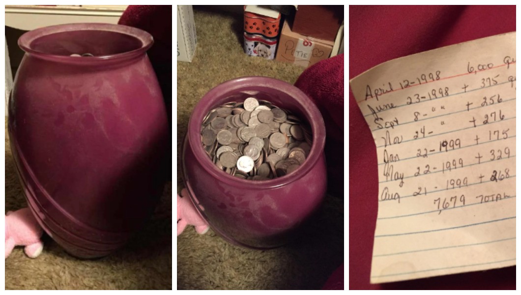 O homem, identificado Vinny, compartilhou três fotografias com a legenda: “Vovó me deu 7.679 moedas de 25 centavos”. Ao todo, o vaso continha uma soma de US$ 1.919 (R$ 10.400) e veio acompanhado de um bilhete, que indica que a senhora guardou as moedas entre abril de 1998 e agosto de 1999.