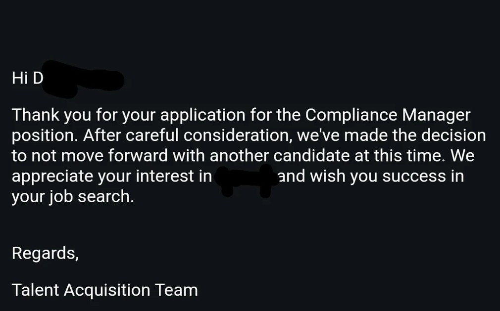 Na captura de tela é possível ver toda a mensagem enviada pelo setor de recrutamento da empresa, que dizia: “Obrigado por sua inscrição para a posição de Compliance Manager. Após cuidadosa consideração, tomamos a decisão de não prosseguir com outro candidato neste momento. Agradecemos seu interesse em [nome da empresa ocultado pelo internauta] e desejamos sucesso em sua busca de emprego”.