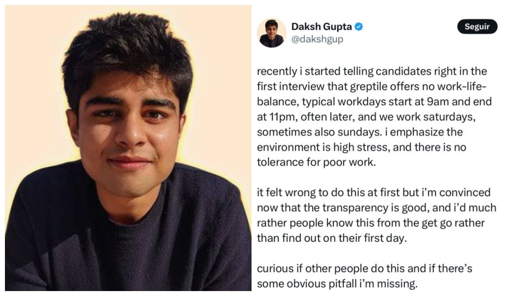 Daksh Gupta, fundador da Greptile, afirmou que sua empresa não oferece nenhum equilíbrio entre vida pessoal e profissional Uma recente publicação nas redes sociais de Daksh Gupta, fundador da Greptile, startup de tecnologia voltada à detecção de bugs com IA, colocou mais lenha na fogueira do debate sobre o equilíbrio entre vida pessoal e profissional em ambientes de startups. Gupta, 23 anos, residente em São Francisco, nos Estados Unidos, defendeu abertamente um ambiente de trabalho de alta intensidade e pouca flexibilidade para seus funcionários. A postagem feita na última sexta-feira (9/11) acumula mais de 1,5 milhão de views.