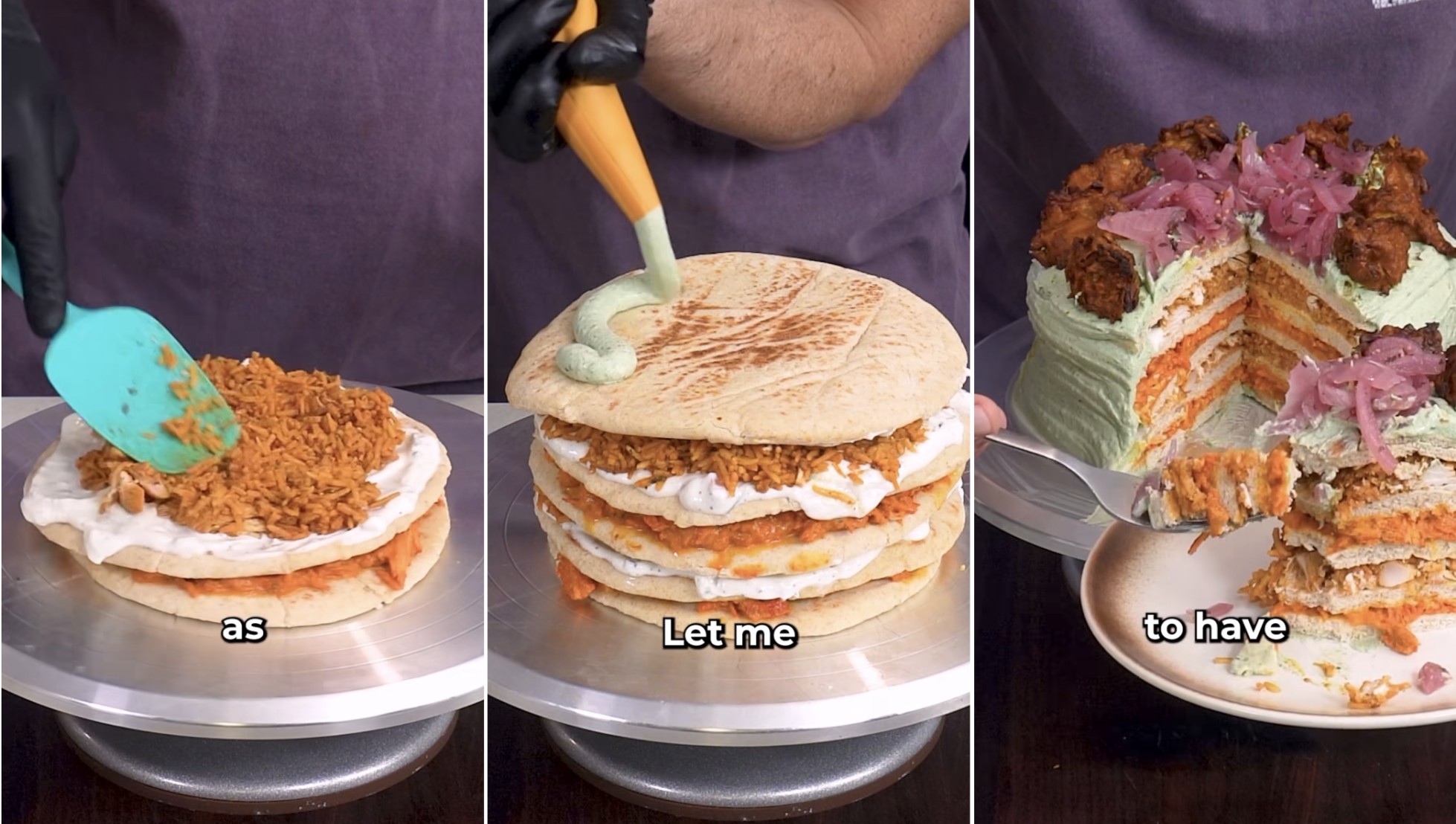 No vídeo, ele faz bolo de frango tikka masala com todas as sobras de comida indiana, incluindo naan (um tipo de pão), e raita (molho a base de iogurte). Por cima ainda é possível ver pedaços e frango e cebolas.