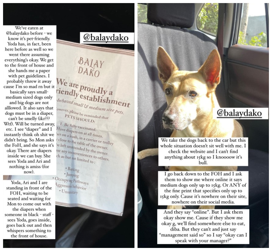 No final de seu post, Lara expressou que aceitaria a decisão de não permitir a entrada se as regras fossem claramente divulgadas no site ou nas redes sociais do restaurante. Ela concluiu sua mensagem aos seguidores informando que o Balay Dako “NÃO aceita animais de estimação, como cães grandes ou aspins, e aconselhou que não se incomodem em visitar.”
