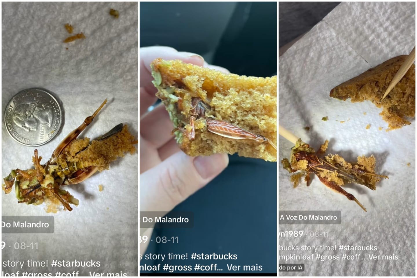 Consumidora compartilhou registros do inseto dentro de um pão de abóbora e questionou a reparação oferecida pela empresa Uma cliente do Starbucks compartilhou no TikTok os registros de uma experiência desagradável após uma compra em uma unidade da marca em Seatle, nos Estados Unidos. Identificada como Teryn, a consumidora afirma ter encontrado um gafanhoto dentro de um pão de abóbora adquirido por meio do drive-thru no dia 1º de agosto.