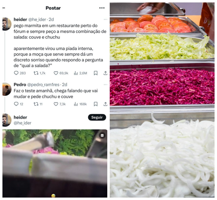 Segundo ele, a atendente sempre lhe pergunta qual salada deseja e, toda vez, a resposta é a mesma: “couve e chuchu”. O hábito frequente não passou despercebido. “Aparentemente, virou uma piada interna, porque a moça que serve sempre dá um discreto sorriso quando eu respondo”, contou na publicação feita na última segunda-feira (09/12).