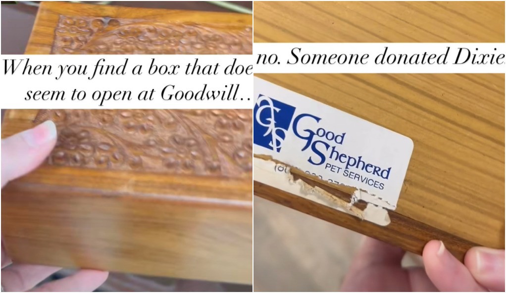 Cliente encontrou o item em loja da rede Goodwill e compartilhou o registro nas redes sociais. Post já soma 2,5 milhões de visualizações Uma cliente resolveu fazer compras em uma unidade da rede Goodwill, que não teve a localização divulgada, e acabou fazendo uma descoberta inusitada e ao mesmo tempo triste. Ao olhar as prateleiras, a consumidora, identificada apenas como Jennifer (@ourthriftyabode, no Instagram), ficou encantada por uma caixa de madeira com detalhes de flores na tampa. No entanto, ela percebeu que havia algo diferente dentro do item, pois não conseguia abrí-lo. Ela compartilhou um vídeo do momento e o registro já acumula 2,5 milhões de visualizações na rede social.