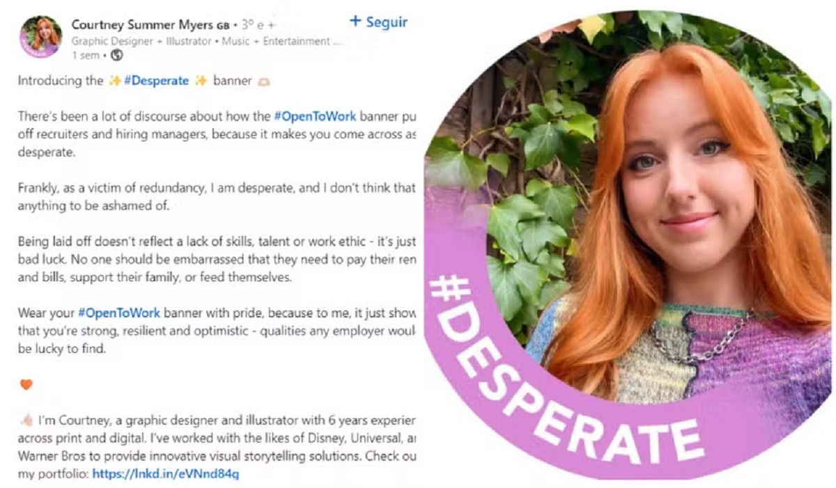 A nova ilustração surgiu após a britânica Courtney Summer Myers refletir sobre o mercado de trabalho e dificuldades da recolocação corporativa A designer gráfica britânica Courtney Summer Myers atualizou seu perfil no LinkedIn, ativando o selo de disponibilidade para novas oportunidades profissionais. No entanto, em sua publicação realizada na última terça-feira (17/9), ela trocou o banner “#Open To Work” por “#Desperate” (desesperada, em português), com uma arte que ela mesma produziu. Para além da ilustração, o post reúne algumas reflexões sobre o mercado de trabalho. Atualmente, o conteúdo conta com mais de 290 mil reações e 6 mil compartilhamentos.