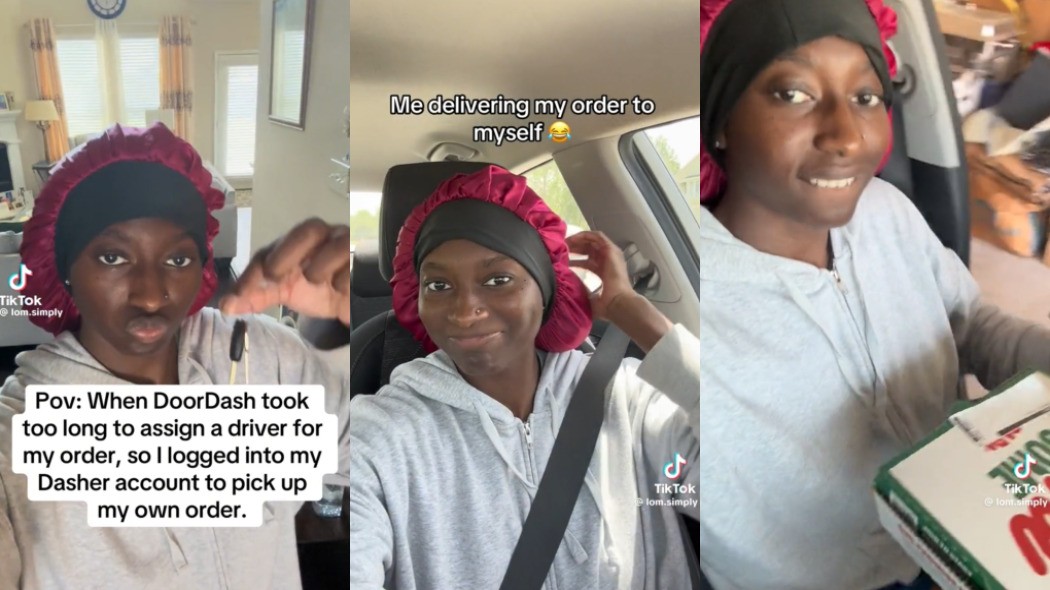 Ela também mostra o aplicativo DoorDash dizendo que um motorista aceitou o seu pedido — e o nome da entregadora é Shalom. O vídeo continua com a profissional pegando seu pedido na rede de pizzarias, seguido por um corte para ela sentada em seu carro. Ela sorri para a câmera sob uma sobreposição que diz: “Eu entregando meu pedido para mim mesma.”