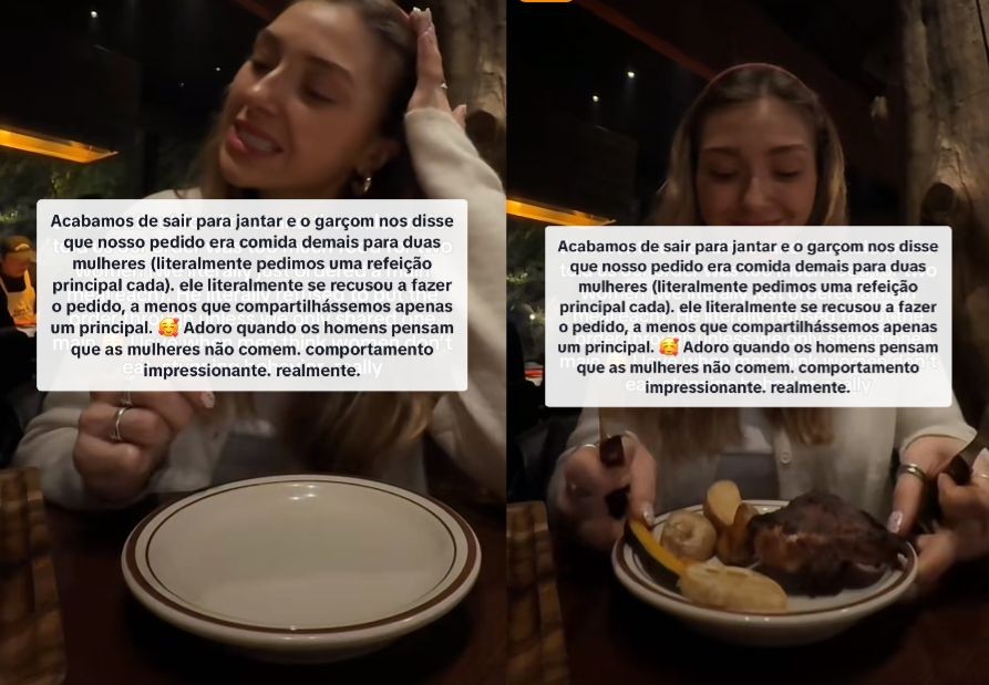 Vídeo que denuncia situação em restaurante já passa de 790 mil visualizações e acumula mais de 600 comentários no TikTok A influenciadora fitness Olivia Nevill compartilhou em seu perfil no TikTok (@livlivinlife__) a experiência curiosa que viveu ao lado de uma amiga em um restaurante na Inglaterra. Segundo ela, ao solicitarem um prato principal cada, o garçom julgou que a quantidade seria demais para duas mulheres e se recusou a anotar o pedido completo.