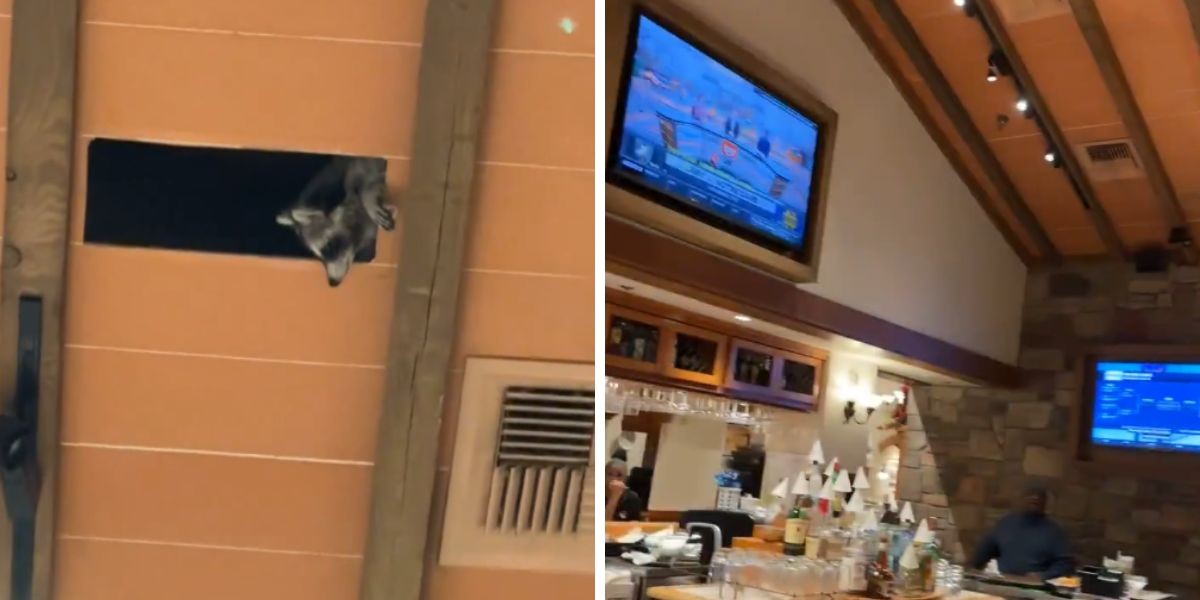 Com a legenda “Há um guaxinim no Dorchester Olive Garden agora mesmo”, o vídeo mostra o animal colocando a cabeça para fora de uma parte quebrada do teto, dentro do restaurante, logo acima do bar. É possível ouvir alguém falando que gostaria de controlar pragas para “cuidar logo disso”.