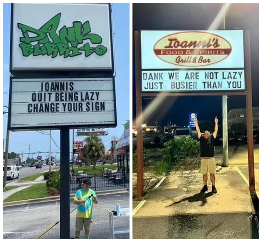 O recado festivo permaneceu no letreiro por semanas, o que levou Merrell, do restaurante vizinho Dank Burrito, a brincar com a situação. Com humor, Merrell atualizou a placa de seu restaurante com a provocação: “Ioanni’s, parem de ser preguiçosos, mudem seu letreiro.”