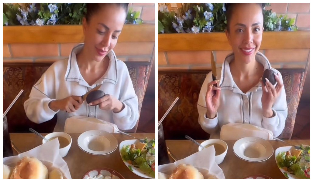 Na cena compartilhada no TikTok, Pineda está sentada em uma mesa de restaurante, tira um abacate da bolsa e o corta ao meio com sua própria faca, que trouxe para o estabelecimento.