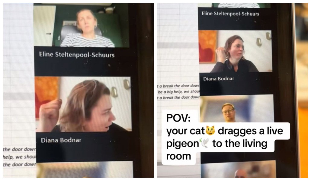 Mulher interrompe reunião de trabalho ao ver gato capturar um pombo vivo e reação viraliza