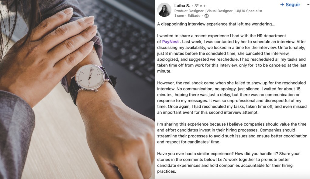 Laiba Saleem publicou críticas após entrevistadora cancelar entrevista oito minutos antes e não comparecer na data remarcada O relato de uma profissional em busca de uma vaga de emprego viralizou no LinkedIn na última semana. Segundo Laiba Saleem, que trabalha como product designer, uma profissional do departamento de RH combinou de entrevistá-la para um cargo na empresa de pagamentos PayNest, mas desmarcou poucos minutos antes. Na data remarcada, a entrevistadora não compareceu.