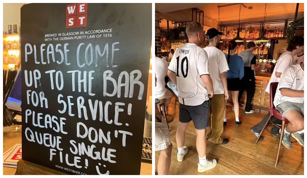 As mensagens espalhadas pelos pubs reforçam o tom da campanha. Em alguns casos, segundo o Daily Mail, os avisos são diretos: “Por favor, pare de formar fila única. Venha ao bar.” Em outro, a recomendação é clara: “Se houver uma fila única na sua frente, vá direto para o balcão.”