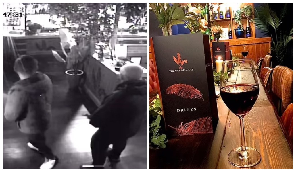 O restaurante compartilhou uma imagem do circuito interno de segurança que mostra os supostos infratores Dois homens são acusados de fugir sem pagar a conta de £ 155 (R$ 1.130) após um banquete de carne e vinho na noite de inauguração de um restaurante chamado Welsh House, no País de Galês. A gerência compartilhou nesta terça-feira (5/11) uma imagem do circuito interno de segurança que mostra os supostos infratores, ambos usando jaquetas com capuz, saindo pela porta da frente.