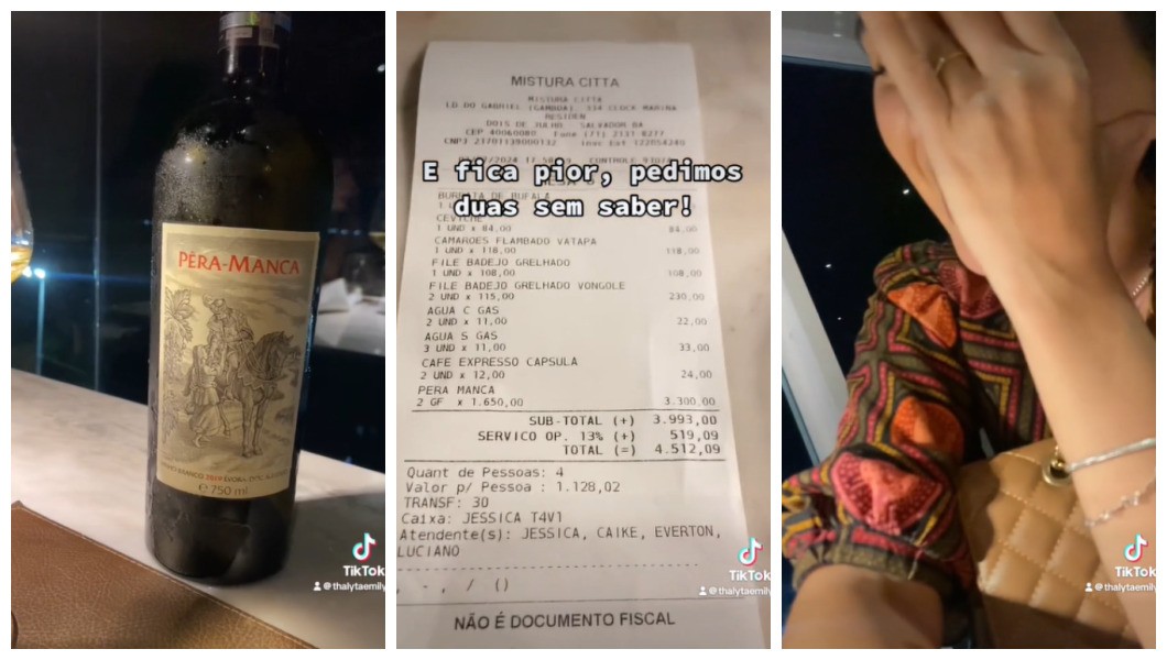 Toda a história começou porque os amigos pediram um vinho que custava R$ 1.650, achando que o valor era R$ 165. Para completar, ainda pediram uma segunda garrafa. O rótulo pomposo era o português Pêra Manca. O vídeo foi postado nas redes sociais e ultrapassou mais de 1,6 milhão de visualizações.