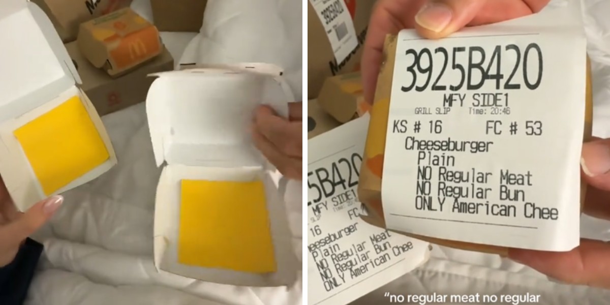 Depois, Cerniglia mostra dois “hambúrgueres” com o único ingrediente e uma embalagem um pouco vazia. Os recibos indicam o motivo o erro: “Cheeseburger simples, sem carne, sem pão, somente queijo”.