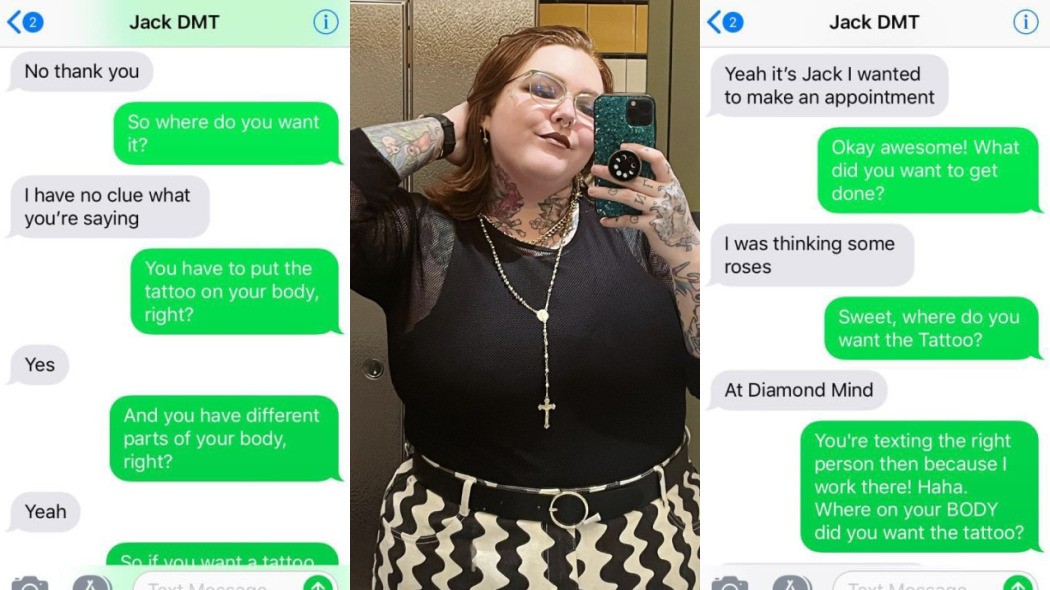 O desentendimento começou quando o cliente espondeu “Diamond Mind”, o nome do estúdio. “Você está enviando uma mensagem de texto para a pessoa certa, porque eu trabalho lá. Onde no seu CORPO você quer a tatuagem?”, perguntou o tatuador. O cliente respondeu que não sabia o que ele queria dizer com isso.
